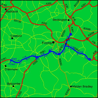 ST 665 435). Proceed East on A361 Straight across Nunney Catch roundabout.